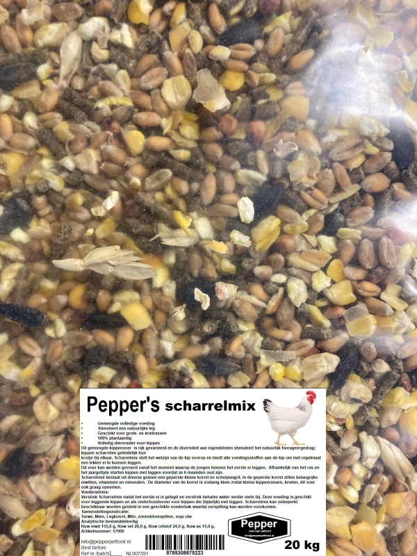 Pepper Scharrelmix is een rijk gevarieerd kippenvoer dat het natuurlijke foerageergedrag van kippen stimuleert. Dankzij de mix van verschillende granen, een geperste kleine korrel en schelpengrit kunnen kippen hun voer op natuurlijke wijze bij elkaar scharrelen. Dit bevordert niet alleen het welzijn, maar ook de vitaliteit van je dieren.