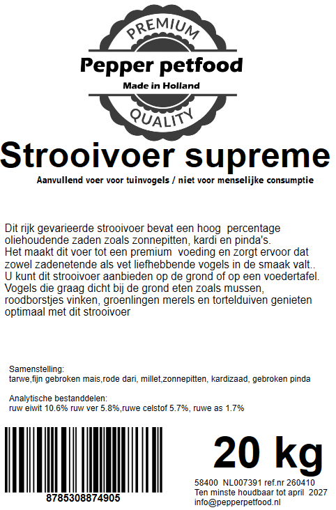 Dit rijke gevarieerde strooivoer bevat een hoog percentage oliehoudende zaden zoals zonnepitten en stukjes pinda. Het maakt dit voer tot een premium voeding en zorgt ervoor dat het zowel bij zadeneters als ‘vetliefhebbers’ in de smaak valt. U kunt deze mix aanbieden op voedertafels en als grondvoer / strooivoer. Vogels die graag dicht bij de grond eten zoals mussen, roodborstjes, vinken, groenlingen, merels en duiven genieten optimaal met dit strooivoer